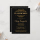 Elegant black and gold college graduation party invitations- Reads 'Class of' with graduation year at the top in antique gold lettering with a shadow effect framed by formal faux metallic, antique gold scrolls. On black background with faux gold confetti dots sprinkled at top and bottom edges. Personalised with graduate's name in elegant, gold lettering script with drop shadow effect. Custom graduation party information, including RSVP details, printed in black, classic lettering. Simply fill in your own graduation party details with the easy to use text template. Back has matching faux gold glitter dots border at top and bottom against black background. Feel free to change background colour to match your school colours or graduation part decor. Chic graduation invites ready to be personalised. Complements black and gold graduation school colours, formal college graduation, and elegant party themes.