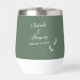 A beautiful elegant formal script typography wedding design with a sage olive green background colour. A unique design that uses a personal classic calligraphy wedding invitation font and a hand drawn greenery leaf branch. A formal script calligraphy design with tones of sage olive green. An elegant wedding wine tumbler design with classic traditional elements. Matching wedding invitations and other stationery items are also available.