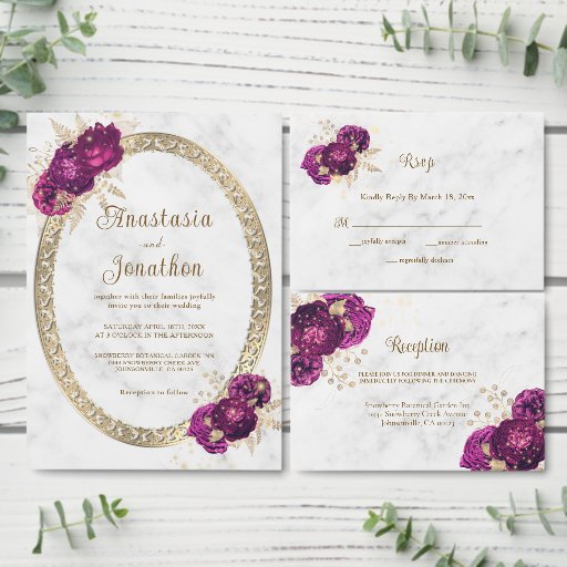 Elegant Fuchsia Floral Gold Marble Wedding Menu.