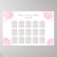 Elegant wedding seating chart poster design features a border of romantic peonies, a monogram of the bride and groom names and wedding date, custom template text for table numbers and guest names. Fuchsia pink, pewter grey, and white colour scheme.