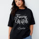 Elegant Halloween custom name shirt for women. The design features "Funny Witch" text in white calligraphy-style typography. Makes for the best personalised Halloween gift for her (it can be anyone from your mother to wife!). Perfect to make them feel special, boost their confidence and get a unique and sassy gift! We have many more such elegant Halloween designs in both black and white underbase for everyone, please check out our collection/store! Happy Halloween!