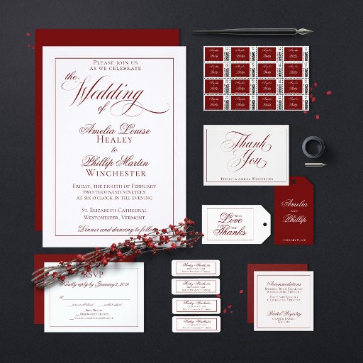 The greatest thing about garnet red is that it is a colour for all seasons! It is romantic and regal and lush, and paired with the right font it can become anything from elegant to whimsical. We went with elegant for this garnet red and white wedding invitation suite. Fully customisable, so feel free to make it whimsical if you wish! Please contact us if you have special requests that cannot be fulfilled using the "Customise" button.