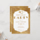 A simple, modern, elegant and chic 40th birthday party invitation template for women with a Gatsby theme, featuring a gold sequins background, the word PARTY covered in gold sequins (simulated, not real sequins) and in modern typography, as well as an elegant "sequins" frame with a white frame background that showcases the gold hue of the modern typography body text. A chic art deco birthday design for a woman on her fortieth birthday.