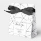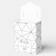 This design features an elegant black and white geometric pattern. The geometric pattern background creates the perfect backdrop for the wedding details. The combination of the black and white colours create a sophisticated, trendy and chic style. Elegant wedding favour box design with modern elements. The modern setup of the typography gives it a distinct style. Matching wedding invitations and other stationery items are also available.