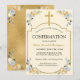 Celebrate your daughter's Confirmation with friends and family by inviting them to your service and reception with this elegant faux gold Confirmation Invitation. This girls confirmation invite features a beautiful simple golden cross with a gold frame against a soft butter cream yellow background and watercolor flowers with peach and blue bouquets in each corner.