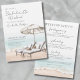 A minimalist beach-themed invitation featuring all grey fonts for a classic and elegant look. The front design includes two white and wood lounge chairs in the bottom right corner, styled with a boho white umbrella and a beach hat resting on one chair. The background on both the front and back showcases a soft watercolor depiction of beach sand, gentle waves, and a serene coastline.