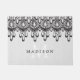 This romantic, feminine grey and black doormat features the look of elegant black lace hanging down over a rustic, grey linen burlap look background. Your monogram initial is in white, and your name is in black.