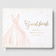 Elegant Quinceanera guest book feature watercolor blush pink dress with sparkle faux gold glitter guest book script, great for sweet 15 birthday party.