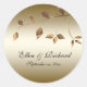 Elegant Gold and Black Falling Leaves Classic Round Stickers designed with Gold Coloured Falling Leaves on a gold background. The black text includes: The Bride and Groom's First Names and Wedding Date. To personalise, simply insert your details into our easy template, replacing the sample text.