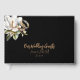 Beautiful white Magnolia blossoms and gold wedding rings on a black background and gold text.