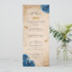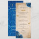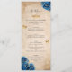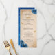 Celebrate in style with custom menus designed for a royal blue and gold theme - a beautiful choice for blue rose weddings, a princess quinceañera, glamorous sweet 16 birthday party, once upon a time bridal shower, baby shower, or any event with a fairytale touch. Featuring original watercolor art by Raphaela Wilson, the unique design highlights deep sapphire blue roses paired with luxurious faux gold accents over a softly aged scroll parchment paper texture for a vintage yet regal feel. A gold princess tiara / queen crown, faux sparkling butterfly confetti, and intricate gown inspired filigree borders bring the personalized menu card to life with storybook elegance. This easy to edit DIY template allows you to personalize every detail - from your name and event title to your dinner selections. You can also fine-tune the colors, calligraphy script and modern typography, and overall layout to match your desired mood, whether it’s chic and modern or richly romantic. Category: floral watercolor quinceanera menus with blue roses; elegant wedding menus; and botanical rehearsal dinner wedding menus. Royal blue quinceanera theme colors: dark blue, royal blue, navy, light brown, tan, ivory white, beige, champagne yellow gold, and black.