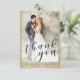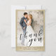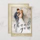 Thank your wedding guests in style with this elegant custom photo thank you flat card. This typography design template features your picture on the front bordered in faux gold with the words "Thank You" and your names with wedding date to personalise. The back of the postcard has a custom message and signature on a faux gold background. Designed by artist Susan Coffey.