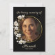 A beautiful and modern funeral invitation featuring elegant white magnolia flowers with soft green leaves and faux gold accents on a classic black background. This sophisticated design combines timeless florals and graceful typography for a refined celebration of life or memorial service. Personalize with your loved one’s photo, name, and ceremony details. The realistic faux gold border and magnolia frame add a touch of warmth and luxury to your remembrance stationery. Please note: the gold is a printed faux effect, not real foil or metallic ink.