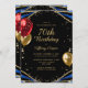 Elegant Gold Blue Agate 70th Birthday Invitation. Chic woman's 70th birthday invite with gold glitter, blue agate marble swirls, red and gold glitter balloons and elegant calligraphy script lettering. Easy to personalise to celebrate the woman turning 70 years old.