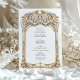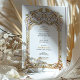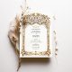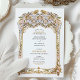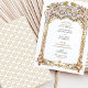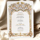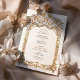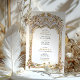 This luxurious wedding invitation showcases a breathtaking gold and blue filigree arch, inspired by intricate palace architecture and baroque detailing. The beautifully embossed floral and scrollwork patterns add a regal, timeless charm, perfect for elegant, traditional, and destination weddings. The combination of soft blue tones with lavish gold embellishments enhances the invitation’s sophisticated appeal, making it ideal for couples seeking an opulent and artistic wedding theme. The refined typography blends seamlessly with the ornate frame, ensuring a stunning and memorable wedding stationery design.