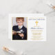 Modern Elegant Gold and Navy Blue First Holy Communion Invitation with Gold Cross and Photo.