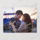 This pretty save the date postcard features romantic script and a large photo. On the front of the postcard, elegant calligraphy that reads "Save the Date" is written in gold and overlays a landscape-orientation photo. The couple's names, wedding date, and wedding location are written in white. Add additional details (such as a wedding website) on the back of the postcard.