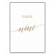 This elegant gold calligraphy table nine table number is perfect for a simple wedding. The neutral design features a minimalist card decorated with romantic and whimsical faux gold foil typography. The card prints on the front and back (double-sided). Other table numbers in the collection are sold separately.