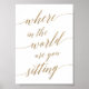 This elegant gold calligraphy Where In the World? sign is perfect for a travel theme wedding. The neutral design features a minimalist poster decorated with romantic and whimsical faux gold foil typography. The sign reads "where in the world are you sitting".