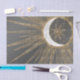 This beautiful, mystical, sun and crescent moon mandala universe theme aesthetic design is perfect for home decor, everyday wear, or special events enchanted decorations. A pretty, whimsical gold sun and moon mandala design, featuring flowers and leaves doodles, stars, dots, diamonds, circles, triangles, and mermaid scale geometric shapes, with a crescent stage glowing moon, a mandala flower star, made with faux gold foil, on a dark grey nebula, galaxy stars, and a grey gradient background.