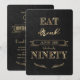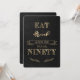Elegant Gold EAT DRINK and be NINETY Birthday card design. It features elegant faux gold "EAT drink AND BE NINETY" typography, ornaments, on a black textured background. Use Customise tool to add your info.For more, please, visit my EAT DRINK BIRTHDAY PARTY Collection.