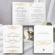 This Elegant Gold Filigree on White, is a perfect traditional invitation for couples who want to acknowledge the old while embracing the new. These invitations feature filigree patterns in both top and bottom, framing your text and emphasizing the centre of the card. This flat card still feels traditional, with its bold serif font and filigree pattern in between the date and time in the text. The bride and groom's names are in an elegant calligraphic font and take up their space at the top, below the filigree patterns. The filigree is available in various colours, so they'll work for any theme, and this - along with the slightly segmented text and simplicity of the rest of the invitation bring the card back into the modern era as well. The filigree designs at the top and bottom add a rich touch to the card as well and make this invitation appropriate for a traditional ceremony.