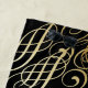 Elegant faux gold foil filigree looking effect scrollwork script on black. Add an initial to this Hollywood Regency inspired glamour piece.