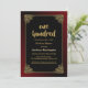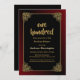 Black 100th birthday dinner party invitation with an ornate gold frame featuring a red ombre outer border to complete the design creating a vibrant invitation for your special occasion.