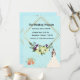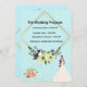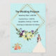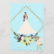 A beautiful wedding program card featuring elegant gold foil details, a geometric frame, and a dusty blue background. Fully customizable for ceremony and reception times.