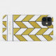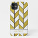 Personalised iPhone 11 case features an elegant chevron design with a geometric herringbone pattern in faux gold glitter, black and white.