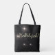 A starry, black night sky is inscribed with a golden "Hallelujah!" in a flowing script on a black tote bag perfect for the holidays. Add a monogram or name in a gold or contrasting font to personalise.