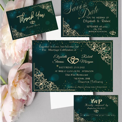 Elegant Gold Hearts Frame Green InvitationsDesigned by Zorica Bozic-Blazic