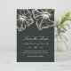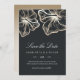 Notify guests of your upcoming destination, beach, or tropical island wedding with these beautiful summer save the date cards featuring faux gold foil hibiscus flower illustrations on a rich, soft black background. Elegant white script and block lettering displays your wedding details (names, wedding date, location, and website).