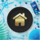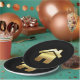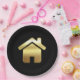 Paper plates with a simple image of a gold gradient house on a black background. Elegant minimalist design.