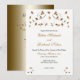 Elegant Gold Leaves Wedding Invitation designed with delicate gold coloured leaf design on a white background. The front text includes: The Bride and Groom's Names, Wedding Date, Time and Location. The reverse side text includes: Reception Detail on a gold coloured background with gold leaf accents. To personalise, simply insert your details into our easy template, replacing the sample text. This Elegant Gold Leaves Wedding Invitation is available in Print and Download.
