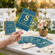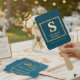 Keep your wedding guests cool and comfortable with these elegant personalized hand fans. Featuring a sophisticated teal blue background framed by a chic faux-gold border, this classic design highlights a prominent monogram initial. Easily personalize it with your future family name and a thoughtful message like "Please, use to keep cool!". Perfect for summer ceremonies, outdoor weddings, and serving as a stylish, practical wedding favor that your guests will appreciate.