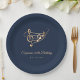 This editable elegant birthday paper plate features a wavy stave with music notes and a treble clef in faux gold on a blue background, complemented by modern script typography. Perfect for adult birthday parties, musical events and music lovers. Customise it with your own text and make use of the editing tool to adjust the font size and placement. Should you require any help with customisation, please feel free to message us on Zazzle.