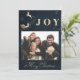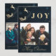 Modern elegant Christmas greeting card featuring a gold reindeer and sleigh and snowflakes under a navy blue starry sky as background, at the front it reads JOY and Merry Christmas in elegant golden calligraphy. You can add 3 photos and your family name at the back of this lovely minimal minimalist card.