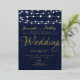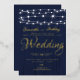 Simple and modern wedding invitation template. Gold calligraphy on a Navy Blue rustic background with pretty string lights decorating the top of the design. Also includes RSVP details and is easy to customise with your own details.