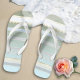 Elegant striped flip flops in pastel green blue and grey beach colours. The waves have a gold stylised design (printed).
