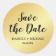 Very elegant envelope seal for your Save the Date cards. Gold background with black text. Save the Date is written in a trendy script font. Your name and wedding date are below in a simple and modern font. All text can be edited.