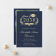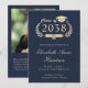 Elegant dark navy blue college graduation announcement featuring the graduate's class year in a light gold illustration of a laurel crest incorporating a grad cap topper and diploma, their name in a light gold classic script, and their school, major, honors or future plans. Add their photo and a personalize message on the back.