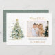 Modern Elegant Calligraphy Script Watercolor Christmas Tree One Custom Photo Christmas Cards. This festive simple minimalist multi photo Christmas Holiday cards features one family photo, watercolor christmas tree with decoration gold balls and confetti, a „Merry Christmas” greeting text which is written in a nice hand lettered font script in gold and white. On the reverse side golden glitter snow or sparkling gold confetti on dusty green background. This festive Custom Personalised Photo Christmas Cards are a great way to remind loved ones that you're thinking of them this Winter Holiday Season.