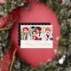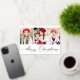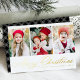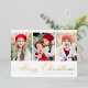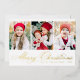 Simple Christmas card featuring three vertical photos with "Merry Christmas" displayed in a festive gold foil calligraphy script. Personalise the front of the multi-photo Christmas card with your family name and the year. The card reverses to display a modern black and white plaid pattern.