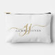A stylish gold script monogram pouch featuring a flowing signature style initial paired with a clean name layout. The simple gold lettering creates a polished look while keeping the design minimal and easy to read. A practical and personalized choice for organizing makeup, travel essentials, or small accessories. Also makes a thoughtful personalized gift and works beautifully as a bridesmaid gift for weddings and bridal parties.
