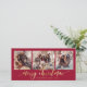 Modern Elegant Red and Gold Script 3-Photo Collage Merry Christmas Holiday Card. Share the warmth of the season with this modern and elegant holiday card, featuring a beautifully arranged three-photo collage on the front. The design is highlighted by a whimsical, hand-lettered Merry Christmas greeting in a faux gold brush-script calligraphy with graceful swashes, set against a rich red background for a festive, timeless look. The back of the card includes a coordinating pre-written holiday message in matching gold on red, creating a polished and cohesive finish.