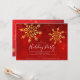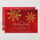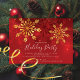 Modern elegance holiday party featuring a red background with gold snowflakes.