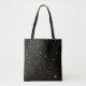 This tote bag showcases a striking design with a deep black background, beautifully adorned with shimmering gold stars of varying sizes. The stars are artfully arranged to create a sense of depth and movement, interwoven with graceful, flowing swirls and delicate dotted patterns that evoke the charm of a tranquil, starlit night sky. The elegant contrast of gold against black enhances the bag's sophisticated and timeless appeal, making it perfect for casual outings, shopping trips, or as a unique and stylish gift. Durable, lightweight, and practical, this tote bag combines functionality with celestial-inspired beauty for everyday use or special occasions.