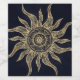 Magical gold sun mandala and sun wavy rays mandala summer design, beautiful sunshine mandala filled with yellow and brown faux gold glitter flowers, leaves doodles, dots, circles, various shapes, a mermaid scale, geometric wavy rays, and a centred mandala flower, celestial universe nebula evening blue sky galaxy stars, the night sky, dark blue nebula background. This unique mystical sun mandala, stylish henna mandala original art, represents the universe, life, and positive energy.