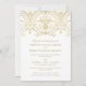 Elegant vintage inspired wedding invitations feature a champagne gold coloured ornate decorative border design that is printed with a metallic shimmer appearance. Printing on the Luxe Pearl Shimmer cardstock option enhances the metallic look of the gold design colours.